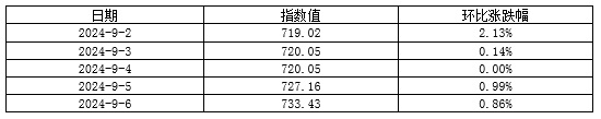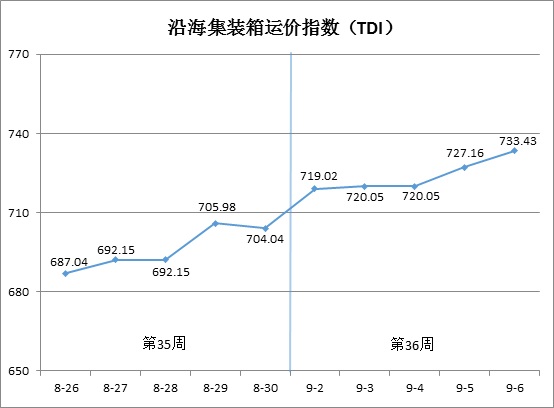 第36周(9月2日-6日),沿海集装箱运价指数(TDI)走势如下图所示: