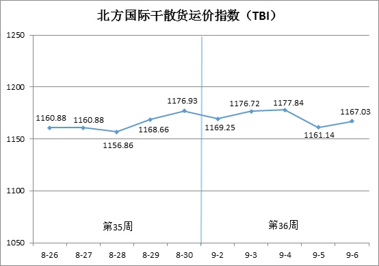 第36周(9月2日-6日),北方国际干散货运价指数(TBI)走势如下图所示: