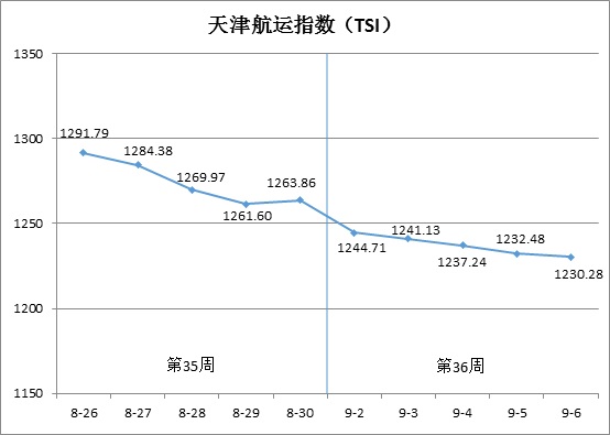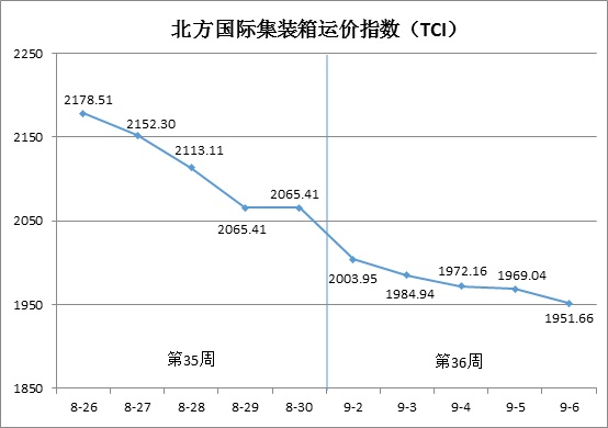 第36周(9月2日-6日),北方国际集装箱运价指数(TCI)走势如下图所示: