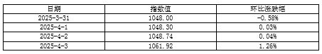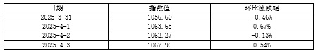 2025年第14周(3月31日-4月3日),因清明节假期,天津航运指数发布4次。北方国际集装箱运价指数波动上行,北方国际干散货运价指数先跌后涨,沿海集装箱运价指数小幅回落,天津航运指数周初延续弱势,周后期震荡上行,并最终收于1067.96点,相比3月28日(第13周最后一个发布日)累计上涨6.47点,累计涨幅0.61%,走势如下图所示: