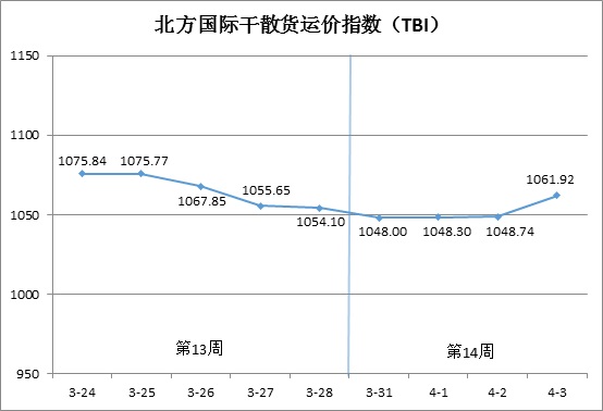 第14周(3月31日-4月3日),北方国际干散货运价指数(TBI)走势如下图所示: