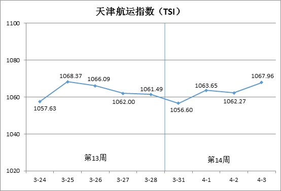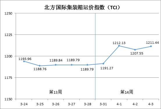 第14周(3月31日-4月3日),北方国际集装箱运价指数(TCI)走势如下图所示: