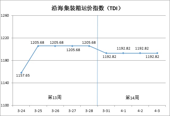 第14周(3月31日-4月3日),沿海集装箱运价指数(TDI)走势如下图所示: