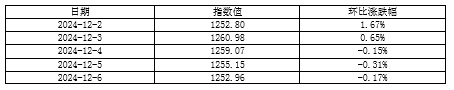 2024年第49周(12月2日-6日),北方国际集装箱运价指数快速上涨后趋稳,北方国际干散货运价指数持续下挫,沿海集装箱运价指数小幅震荡走低,天津航运指数冲高回落并最终收于1252.96点,相比11月29日(第48周最后一个发布日)累计上涨20.69点,累计涨幅1.68%,走势如下图所示: