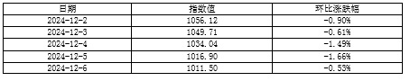 12月2日至4日(周一至周三),煤炭及粮食市场运价小幅下跌,金属矿石市场运价明显下挫,TBI延续弱势,三个发布日累计下跌2.97%。随后,粮食市场运价略有企稳回升,煤炭及金属矿石市场运价延续下行态势,TBI在5日至6日(周四至周五)进一步下跌并最终收于1011.50点,相比11月29日(第48周最后一个发布日)累计下跌54.23点,累计跌幅为5.09%。