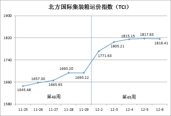 第49周(12月2日-6日),北方国际集装箱运价指数(TCI)走势如下图所示: