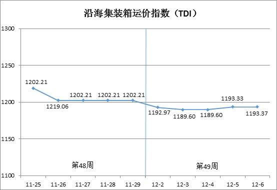 第49周(12月2日-6日),沿海集装箱运价指数(TDI)走势如下图所示: